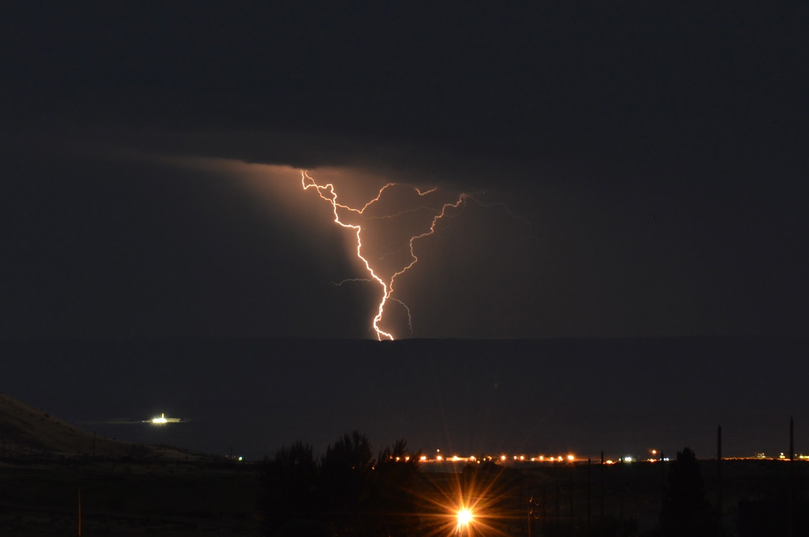 From Tridell looking south about 60-80 miles is the Book Cliffs. Most days it is clear enough to see them gradually rise out of the desert, with a big cut where the Green River runs through Desolation Canyon on to Green River and Moab. For the past month or so there have been quite a few big thunderstorms at night and it is awesome to watch the lightning flash across the whole southern horizon. Hearing the thunder would be fun too, but it is a little far away for that. Here are some pictures we took the other night. Yes I am proud of them. I have wanted to have a camera I could do this with for quite some time, so yes I was excited when the first one turned out. These were on a 30 second exposure.
